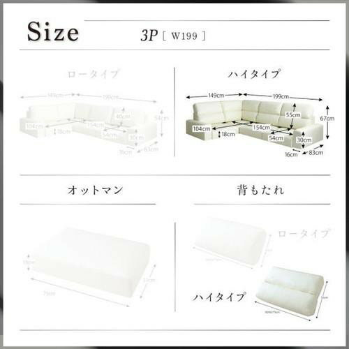 【商品名】フロアコーナーソファ【サイズ】3人掛け (ロータイプ/ハイタイプ)(約)横幅199(座面幅154) 奥行149 高さ54/67 cm3.5人掛け (ロータイプ/ハイタイプ)(約)横幅229(座面幅184) 奥行164 高さ54/67 cm4人掛け (ロータイプ/ハイタイプ)(約)横幅249(座面幅204) 奥行174 高さ54/67 cmオットマン:(約)横幅75 奥行51 高さ18cm【梱包数・梱包サイズ】3人掛け:梱包数 5<本体> 3梱包ロータイプ:(約)52 69 34cm 3梱包ハイタイプ:(約)52 69 39cm 3梱包<肘> 1梱包(約)33 82 31cm<コーナー> 1梱包(約)85 85 44.5cm 3.5人掛け:梱包数 5<本体> 3梱包ロータイプ:(約)66 69 34cm 3梱包ハイタイプ:(約)66 69 39cm 3梱包<肘> 1梱包(約)33 82 31cm<コーナー> 1梱包(約)85 85 44.5cm 4人掛け:梱包数 5<本体> 3梱包ロータイプ:(約)77 69 34cm 3梱包ハイタイプ:(約)77 69 39cm 3梱包<肘> 1梱包(約)33 82 31cm<コーナー> 1梱包(約)85 85 44.5cm オットマン:梱包数 1(約)77 53 20cm【素材】生地:合成皮革中材:天然木・チップウレタン・ポリエステル綿・ウレタンフォーム・連結式鋼製組バネ、合板【カラー】アイボリー、ブラウン、ブラック【生産国】中国※1年保証付き※お客様組立品(組立て作業は2人以上で行って下さい。